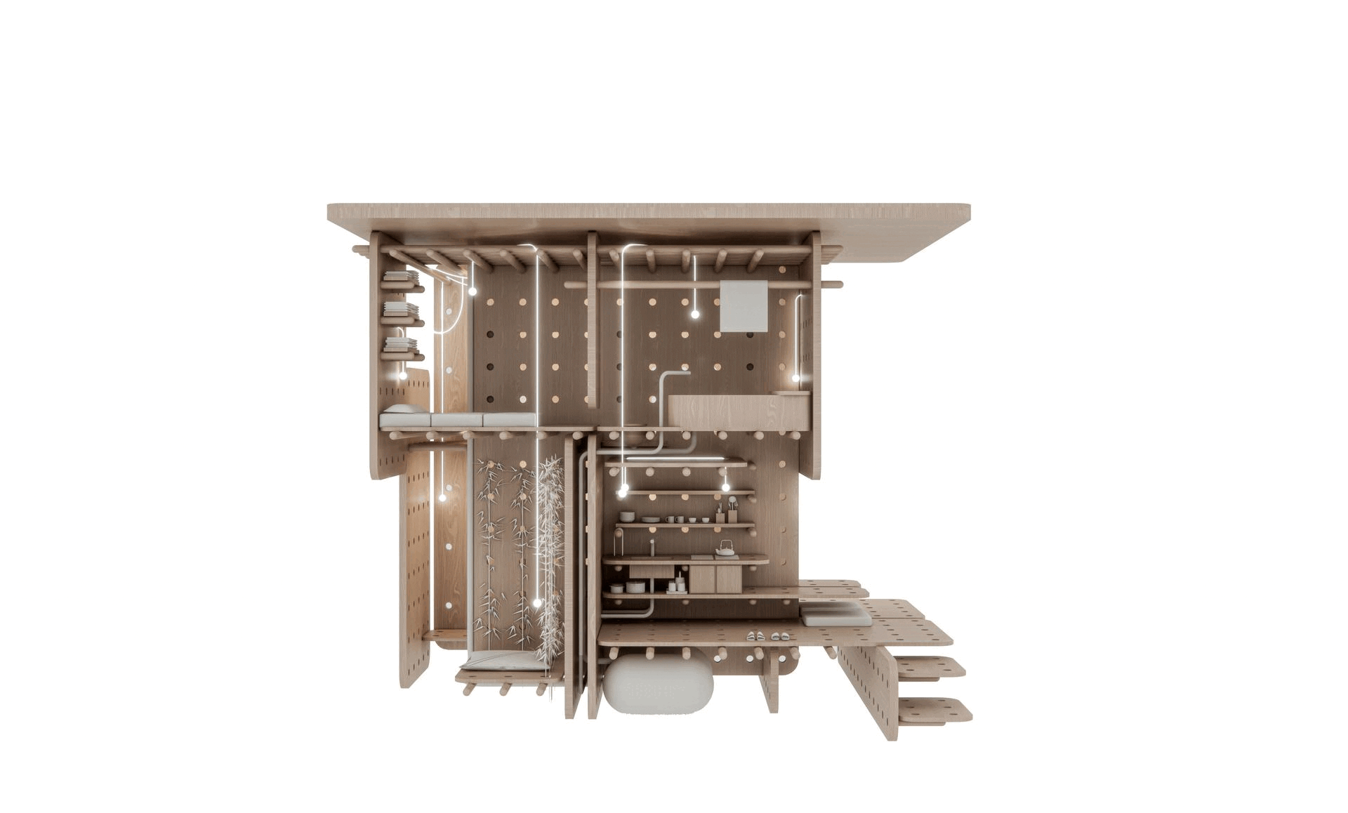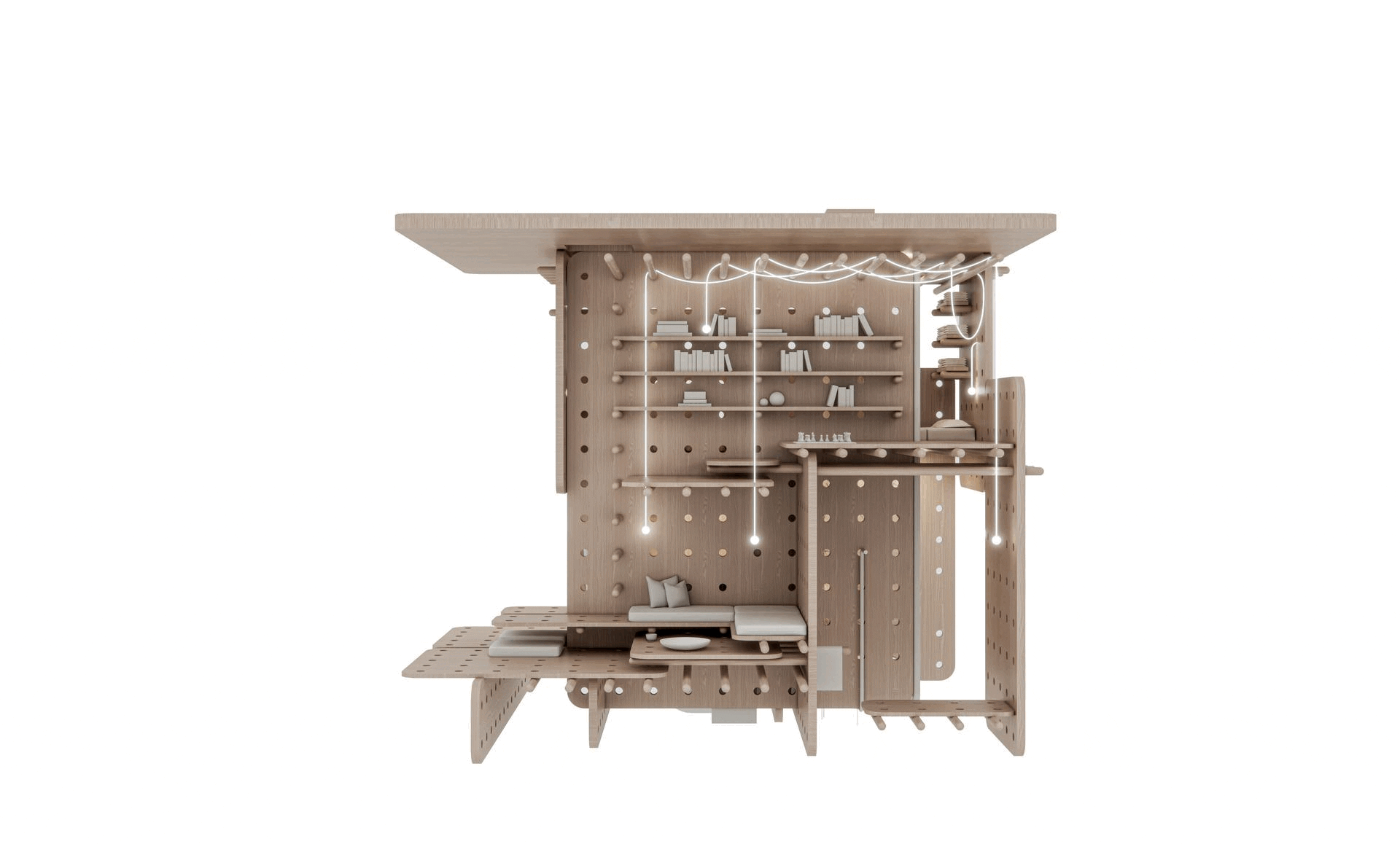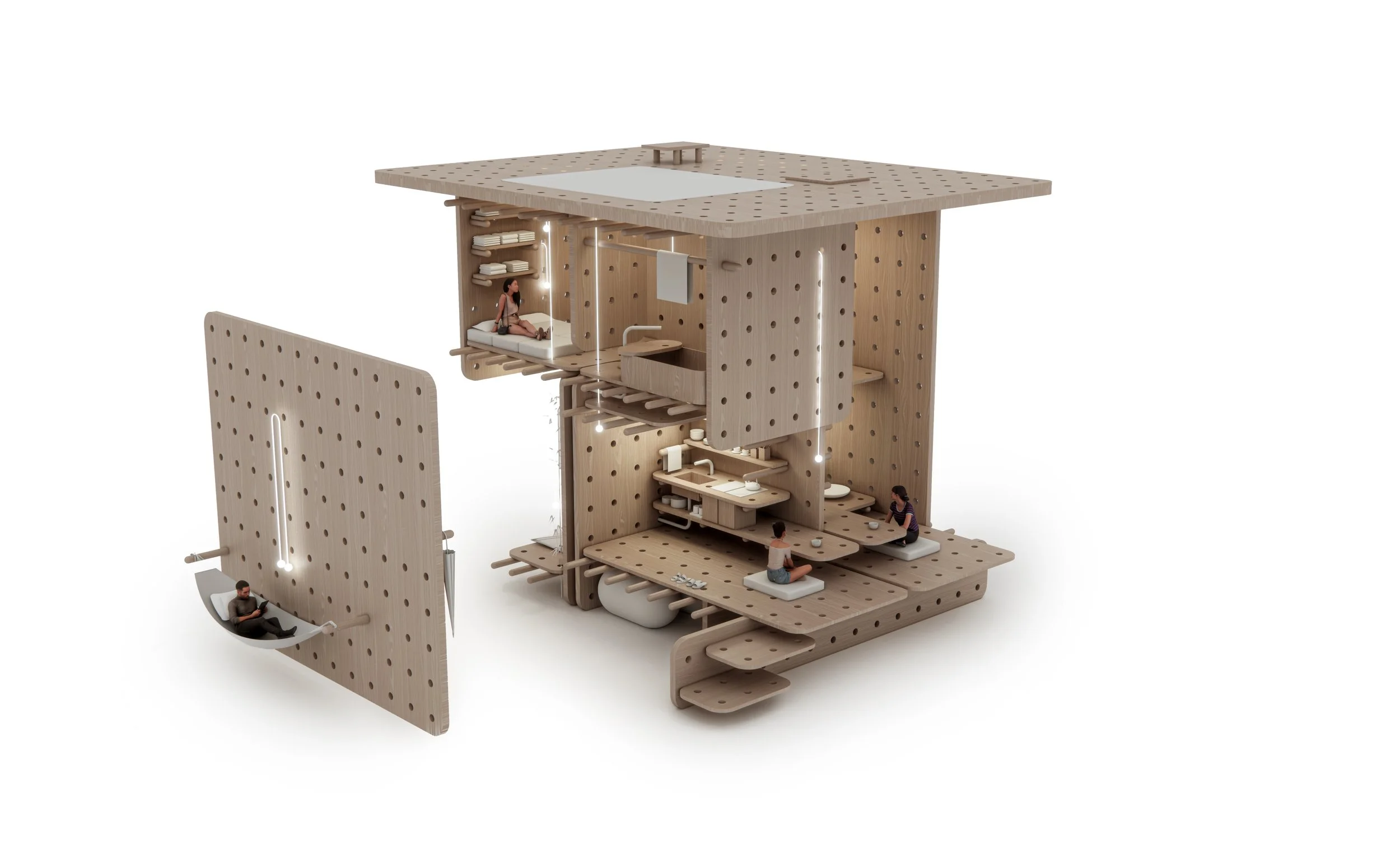 The Peg House proposes a novel residential concept echoing the inherent modularity of the pegboard. This user-centric design utilizes a sustainable, interlocking wooden component system that integrates with a pre-drilled grid within walls and floors. Much like a pegboard, this grid becomes a dynamic framework where residents can actively configure spaces and furniture, fostering adaptability and eliminating the need for fixed elements.