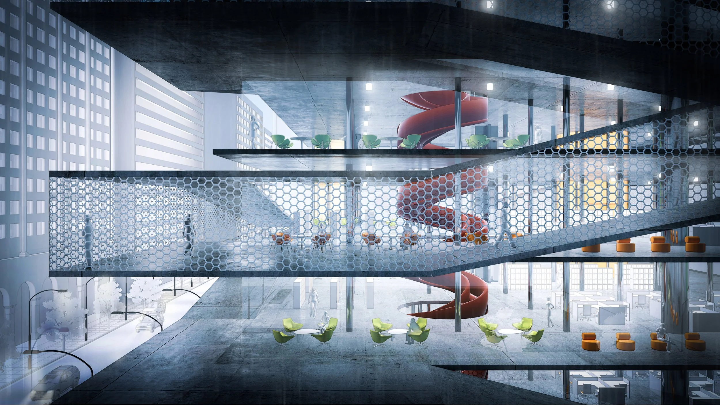 This project explores a concept of programmatic transparency within a built environment. It utilizes a dematerialized envelope through a fully transparent facade, fostering a visual and physical permeability with the surrounding context. This seemingly open structure is then intersected and activated by strategically placed programmatic elements within the circulation spaces. These elements are not merely interruptions, but rather become the functional core of the design.