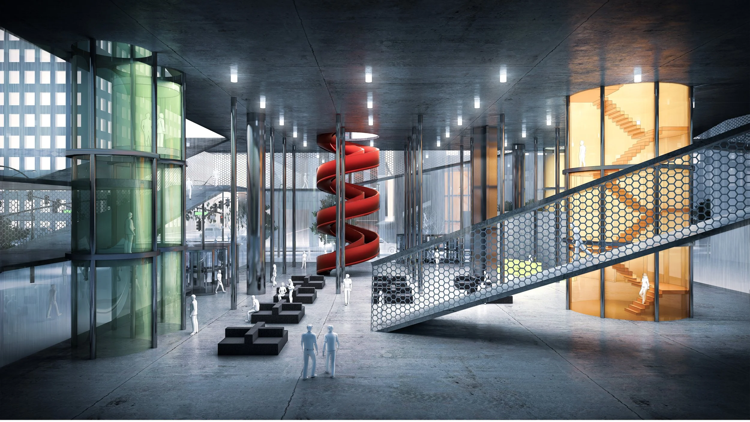 Elevator Shafts: Housed within brightly colored, transparent tubes, these shafts become a visually dynamic core. They not only serve their functional purpose but also channel natural light deep into the building by connecting with roof skylights.