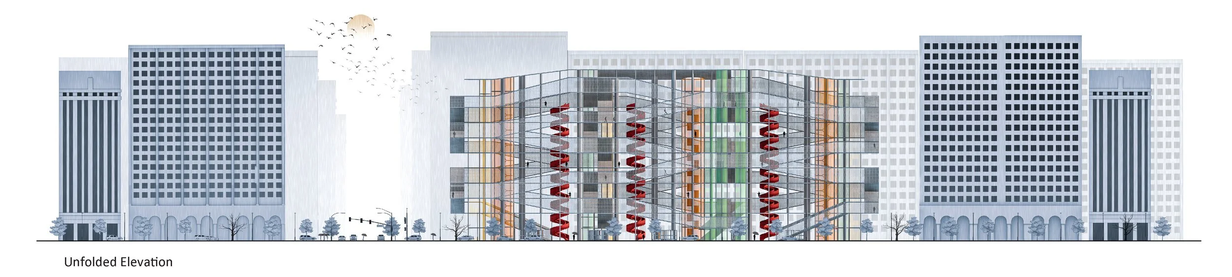 Exterior Ramps: Wrapping the building, these ramps act as a public, continuous pathway connecting all levels. They become a visually striking element, integrating circulation directly into the building's form.
