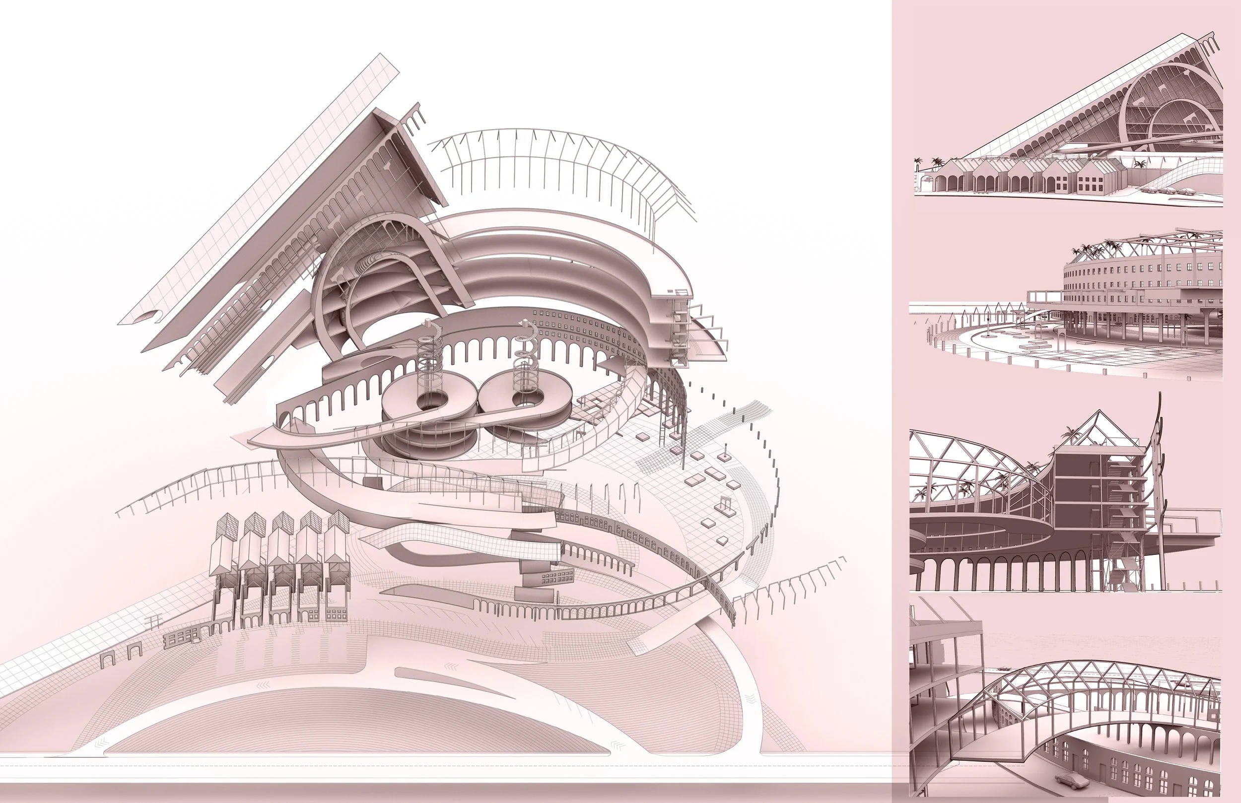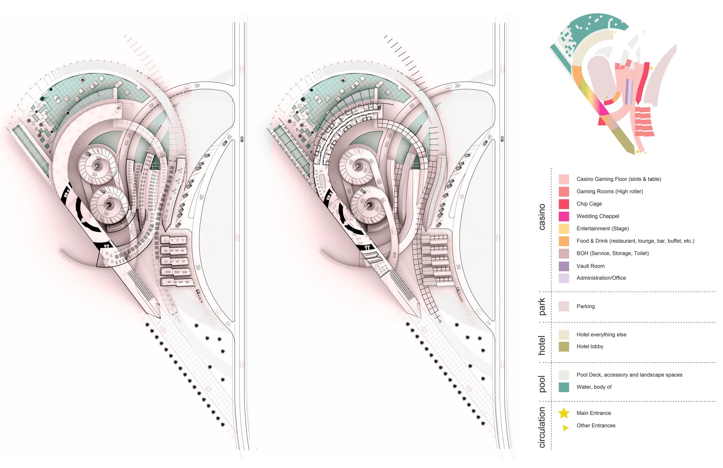 The casino emerges from the desert landscape as a dynamic interplay of topographical grids. These grids, originating from the natural terrain, manipulate and distort the building's form. The resulting structure is a fragmented and expressive entity, with arched doorways extending beyond the building envelope to create new spatial boundaries within the desert. The casino's layered and overlapping roofs, penetrated by the grid, generate a complex and illusory interior space. This interior accommodates a fluid and open gaming floor, enabling visitors to move freely between gaming tables and slot machines. The structural frame, influenced by the directionality of the grid, behaves as a living organism, connecting the casino to the hotel and generating additional interstitial spaces within the gaming floor. The hotel's form is further disrupted by the emergence of the chapel and entertainment spaces, which rise from the ground and elevate portions of the building. This programmatic collision creates a new vehicular and pedestrian access point. The remaining architectural elements of the hotel continue to expand and evolve, resulting in a hybrid structure that appears to be in a perpetual state of becoming. This unfinished and indeterminate form challenges traditional architectural conventions and invites speculation about the building's future