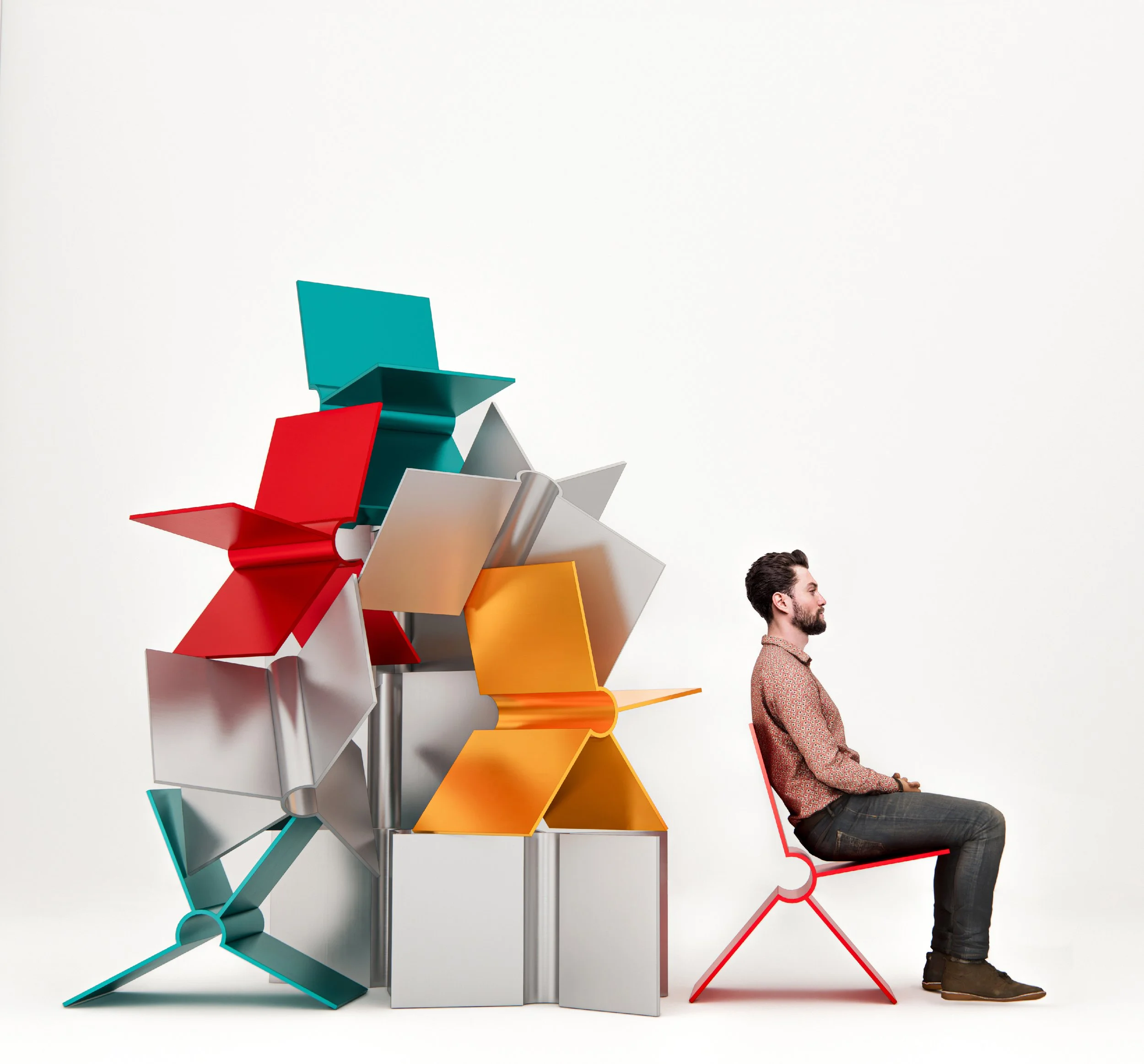 This radial organization also imbues the piece with a sense of dynamic potential. When stacked or positioned differently, the form appears deconstructed, a playful result of the interplay of volume and profile. Its thin profile transforms with viewing angle, revealing a surprising sense of mass. This visual play challenges our perception of weight and suggests a form that is both slender and substantial. The OK chair celebrates the notion of embracing contradictions. It is a rebellious design that breaks free from conventional expectations. By exploring the unorthodox, the chair establishes a new vocabulary for seating, one that celebrates adaptability and an interplay of perception.